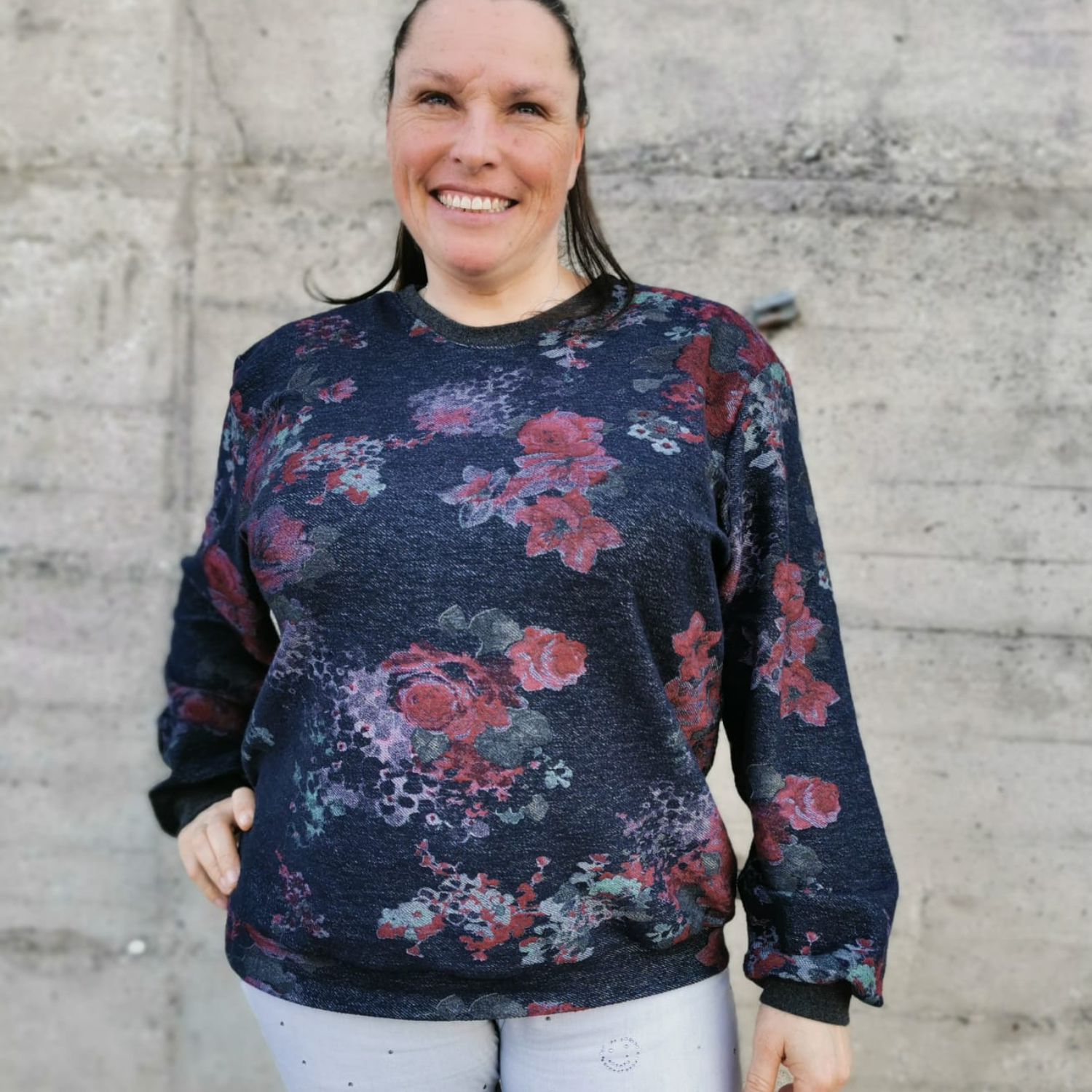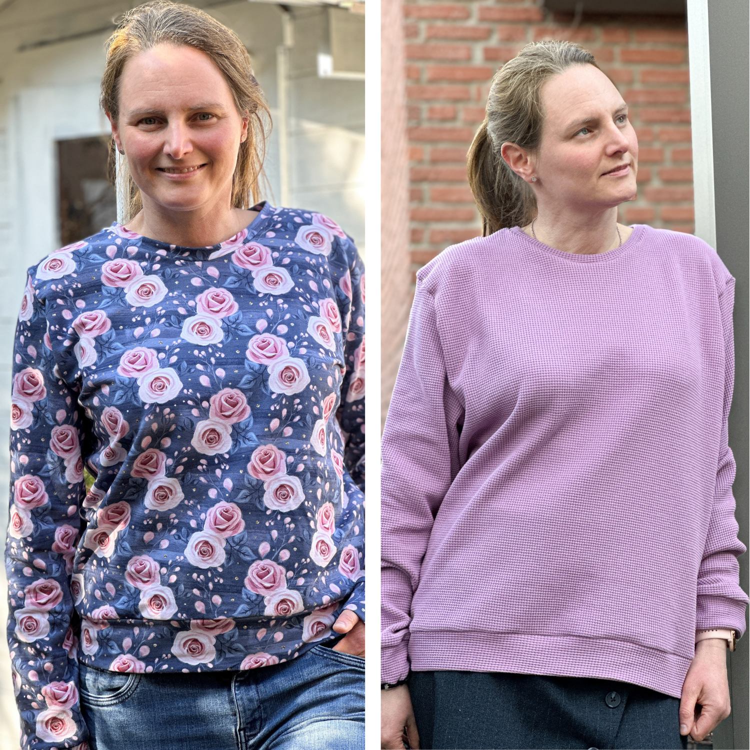 PAULA lässt sich aus verschiedenen dehnbaren Stoffen nähen. Besonders gut eignen sich Baumwolljersey, French Terry (Sommersweat), Sweatstoffe (Alpenfleece/Wintersweat) oder Strickstoffe. Je nach Material wirkt der Pullover leichter oder kuschelig warm. Wichtig ist, dass der Stoff bequem ist und sich angenehm auf der Haut anfühlt.