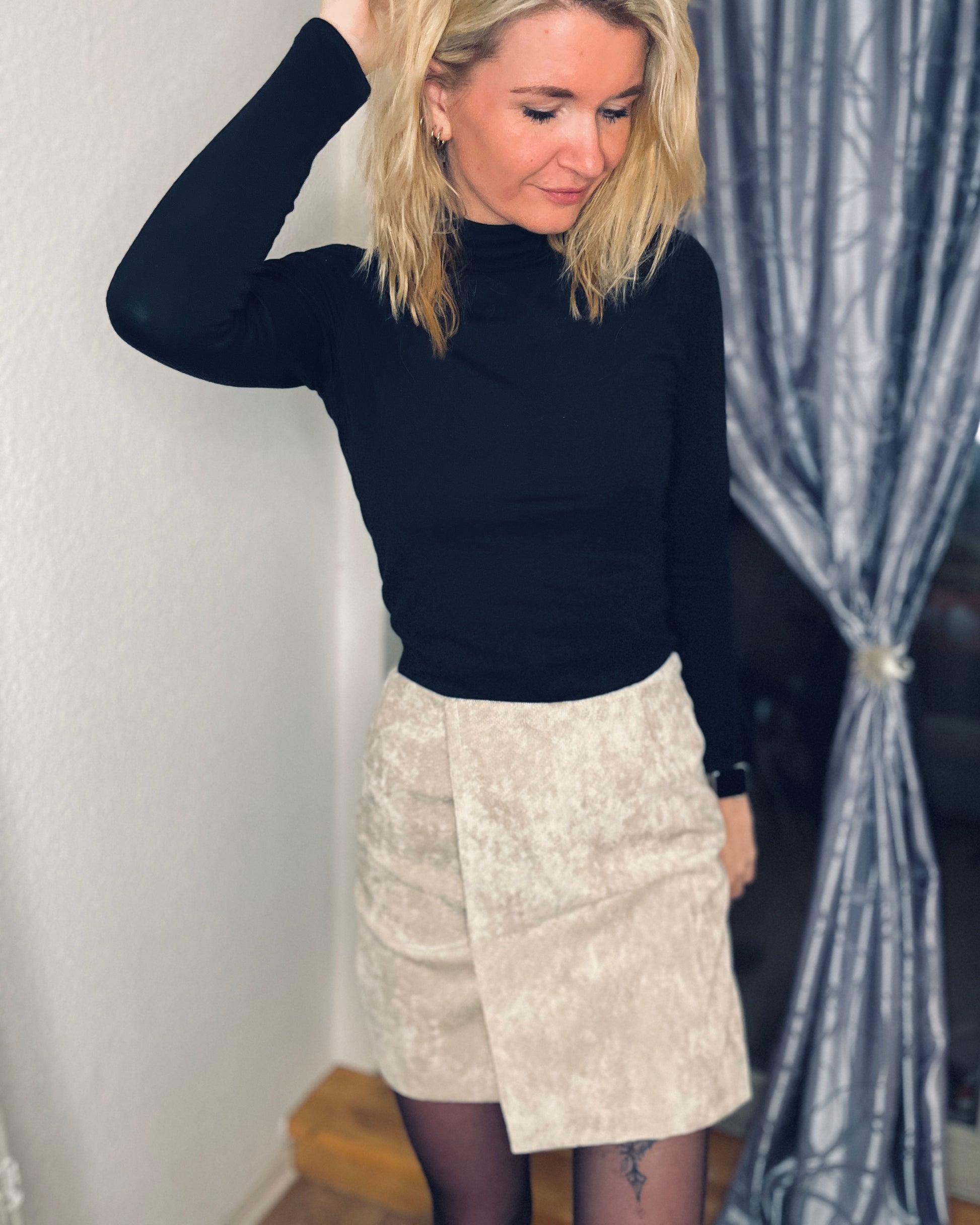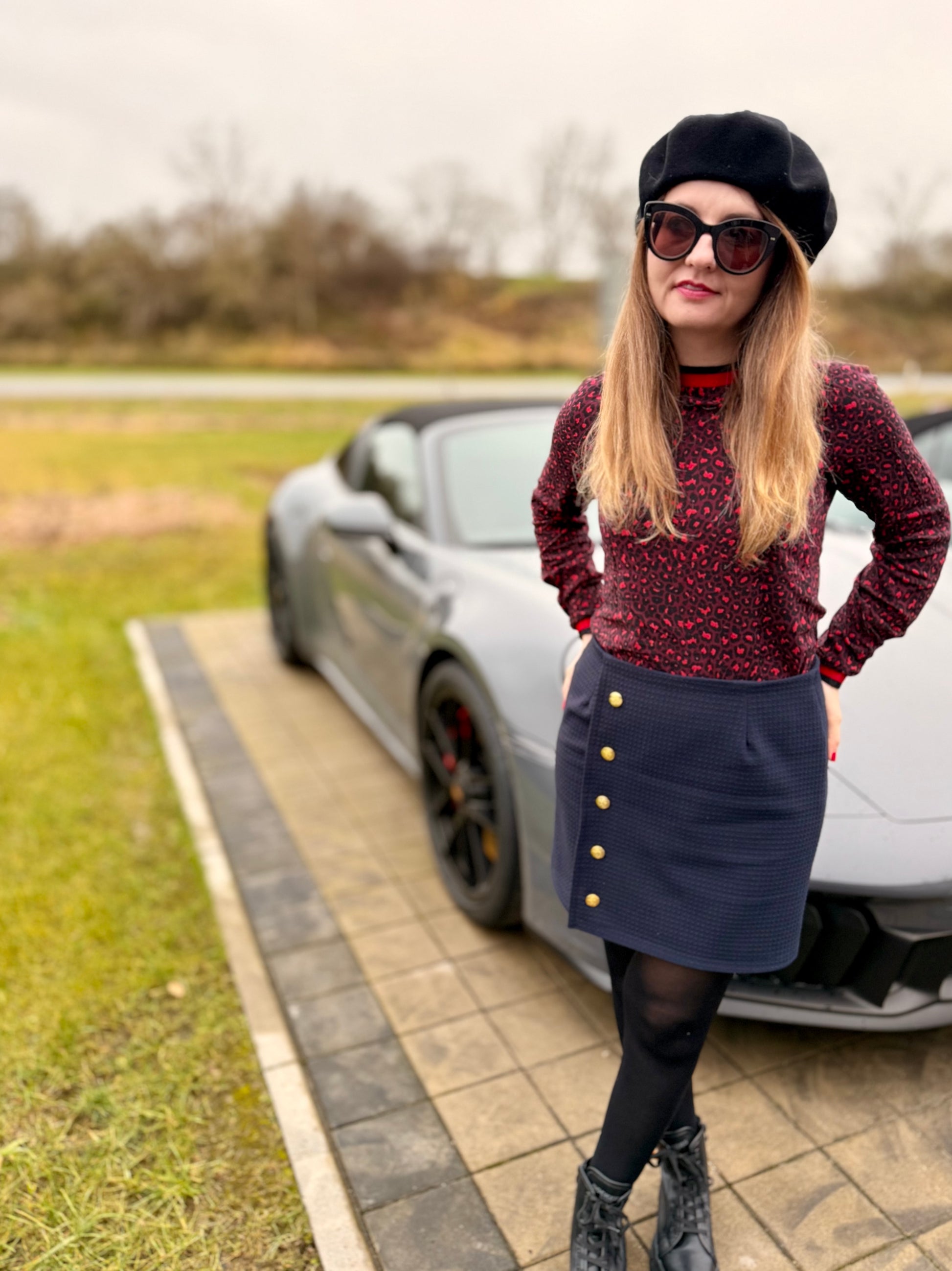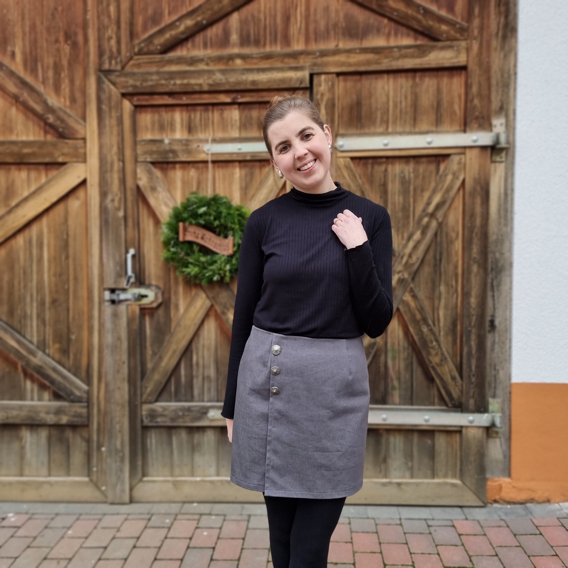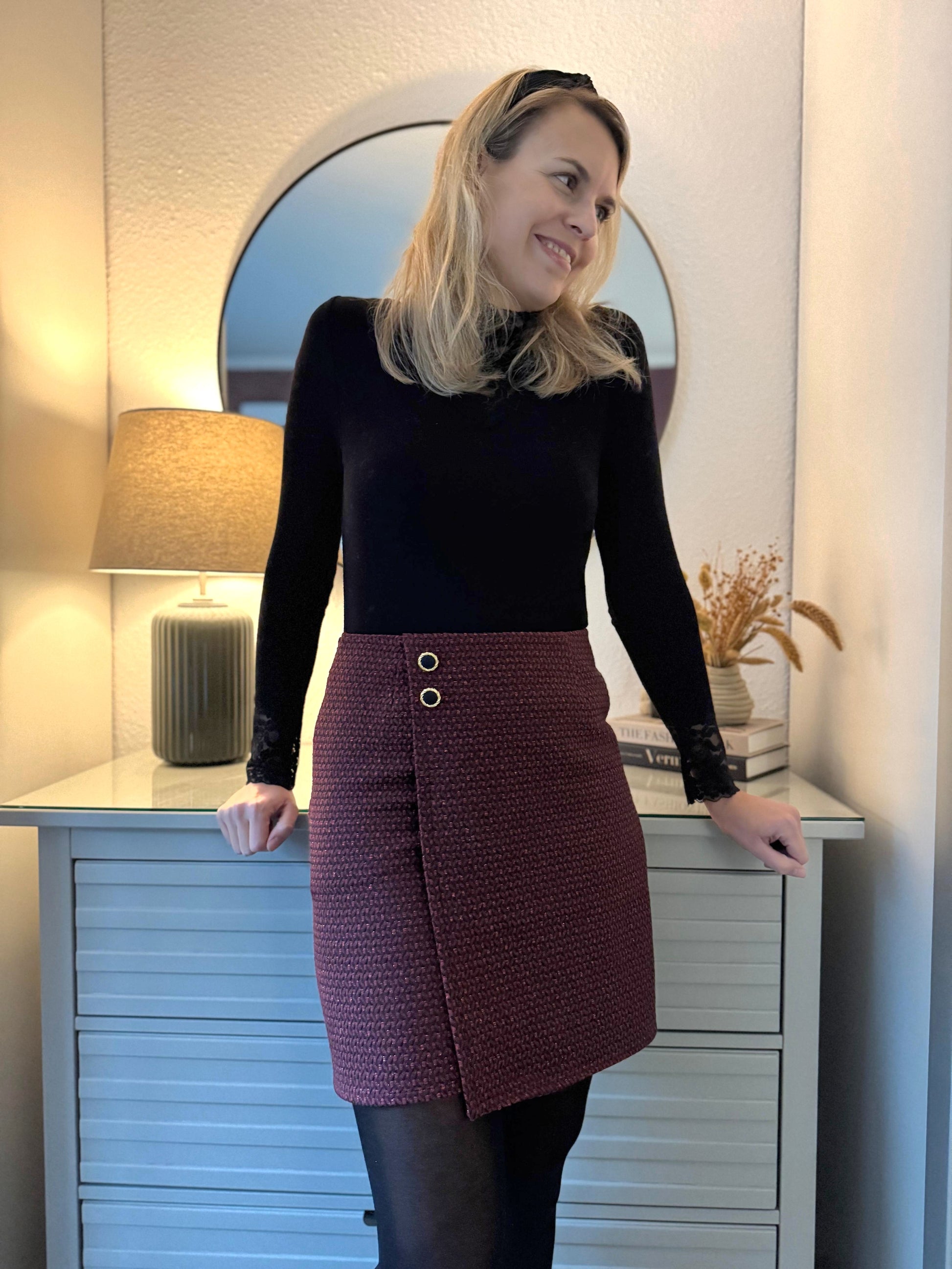Das Schnittmuster LILLY präsentiert einen figurnahen Minirock mit raffinierter Wickeloptik. Der Rock endet oberhalb des Knies und betont durch seine schmale Passform die Silhouette. Das Besondere ist der Übertritt im Vorderteil, der den Anschein eines Wickelrocks erweckt. Der Übertritt auf der Vorderseite ist das besondere Highlight dieses Modells: Durch die dekorativen Knöpfe, die vertikal angebracht sind, wird die Illusion eines Wickelrocks erzeugt. Anders als bei echten Wickelröcken sorgt LILLY jedoch dafür, dass beim Sitzen oder Gehen nichts verrutscht.